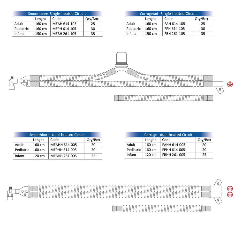Tek kullanımlık ısıtıcılı hasta devreleri, smoothbore veya koruge hortum tiplerinde; tek ısıtıcılı veya çift ısıtıcılı seçeneklerle üretilmektedir..