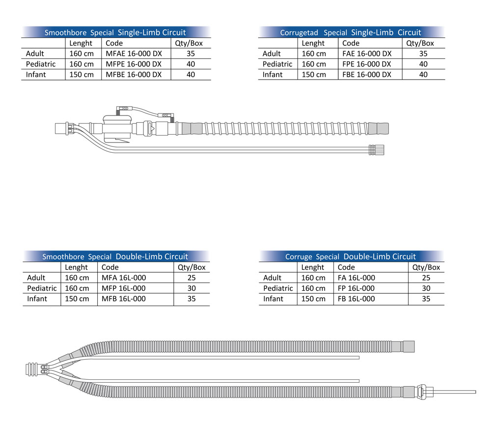 Tek kullanımlık özel hasta devreleri; yetişkin, pediatrik ve yenidoğan hasta gruplarında kullanılan ventilatörler için özel olarak tasarlanmıştır. Tek hatlı veya çift hatlı olarak üretilebilen bu devreler, akış sensörü gibi cihaza özgü bileşenlerle yapılandırılarak hedef ventilatör ile tam uyumluluk sağlar. Tek ısıtıcılı ,çift ısıtıcılı, su tutuculu seçenekleri ile imal edilir. Smoothbore veya koruge alternatifleri ile cihaz gereksinimlerine uygun şekilde üretilmektedir.